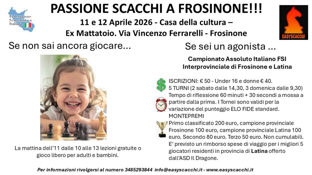 Nel prossimo fine settimana Easyscacchi organizza il Campionato provinciale a Frosinone presso la Casa della Cultura. Il sabato mattina gioco libero e lezioni gratuite per principianti.